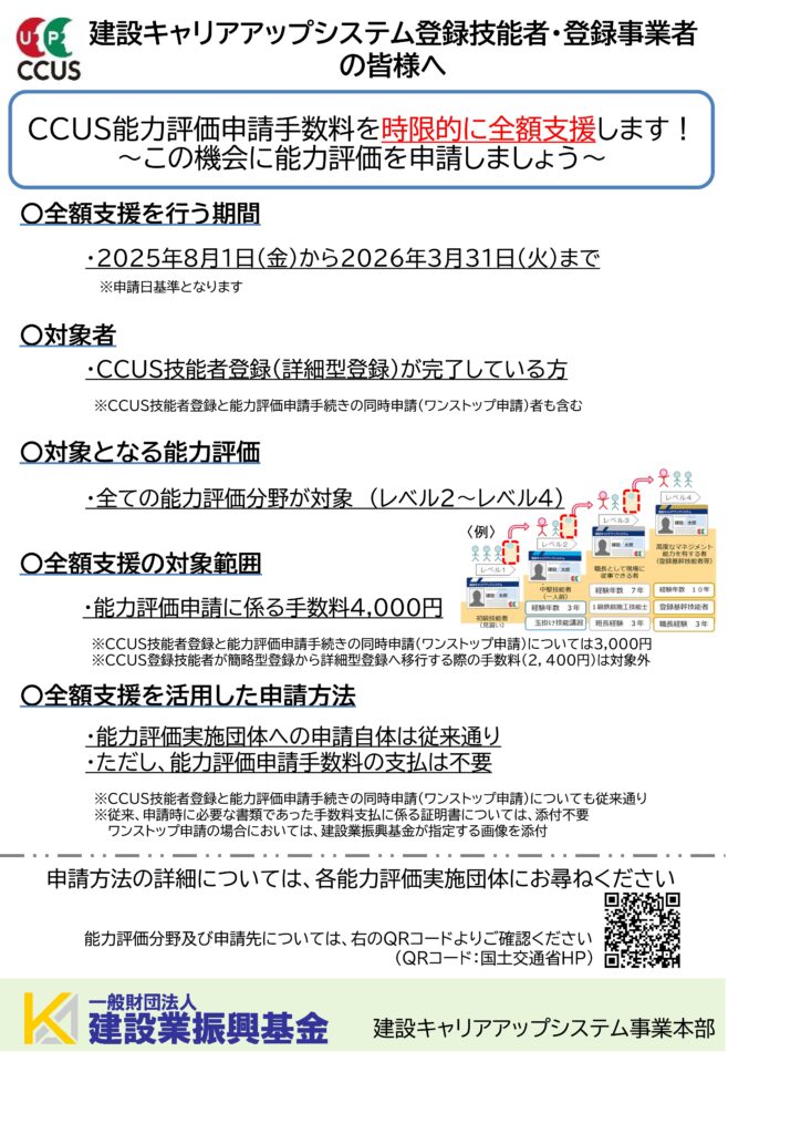 建設業振興基金|能力評価申請手数料の全額支援について(2025.8.1~2026.3.31) より出典