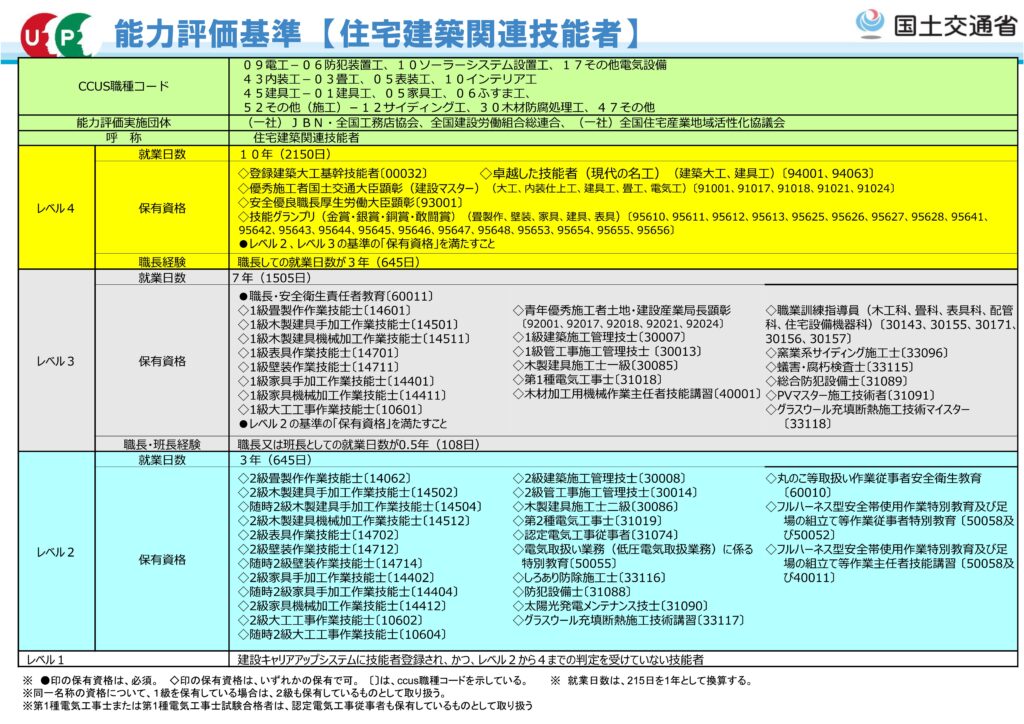 3職種の評価基準を記載いたします。土質改良技能者、潜函技能者、住宅建築関連技能者で能力評価を受けてみたいという技能者の方は評価基準をよく確認し、レベルアップが行えそうであればこの機会に能力評価申請手続きをしていただければと思います。