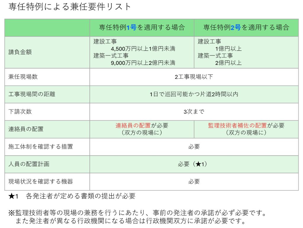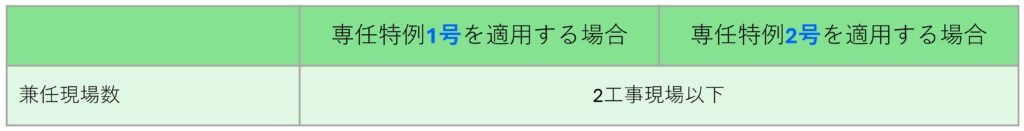兼任現場数は専任特例1号、専任特例2号で差はありません。兼任が行える現場数は最大2現場までとなっております。専任特例1号は小規模案件のため会社の支援体制によっては3現場井以上の現場管理も可能かもしれませんが、残念ながら2現場以上の兼任を許容しておりません。