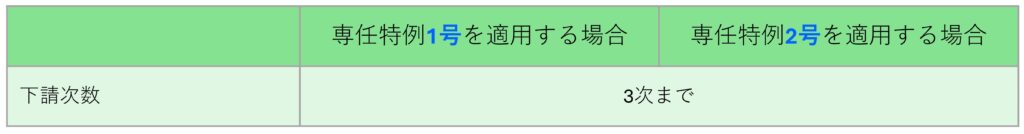 下請次数も同様、専任特例1号、専任特例2号で差はありません。協力会社は3次までとされています。小規模案件の専任特例1号であれば3次までの制限は特段の問題はないと思いますが、中・大規模の専任特例2号だと現場の工事内容が建築工事等であると厳しい状況もあるかもしれません。兼務を予定して受注する案件は事前に協力会社の再下請けの施工体制についても要確認・調整が必要になります。