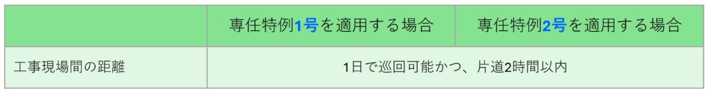 工事現場間の距離も同様、専任特例1号、専任特例2号で差はありません。こちらの要件は大雑把ですが片道2時間以内となっています。都市部と地方部でもちろん差はありますが一般的に車で2時間の移動距離は約60km、電車(普通)で50kmだそうです。このことから兼任の現場間にだいぶ距離があっても許与されるのがわかりますが見落としできないが、「1日で巡回可能」という文言です。発注者のとらえ方によりますが1日1回は現場を巡回しなくてはいけないようにもとらえることができます。「1日で巡回可能」については発注者に要確認が必要です。