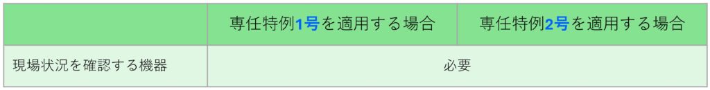 現場状況の確認のための情報通信機器についても同様、専任特例1号、専任特例2号で差はありません。こちらはスマートフォンやタブレット端末のビデオ通話はじめ、SNSを利用したビデオ通話、Web会議システムの利用が可能なため新たに何かを導入しなくても手持ちの事務備品で対応が可能だと思います。