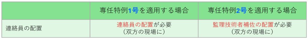 連絡員の配置は専任特例1号、専任特例2号で大きく差があります。連絡員は監理技術者の補助を行う重要な役割を担い、当該現場兼任の肝になる要件になります。では専任特例1号、専任特例2号で監理技術者を支援する連絡員の違いを下記に記載いたします。