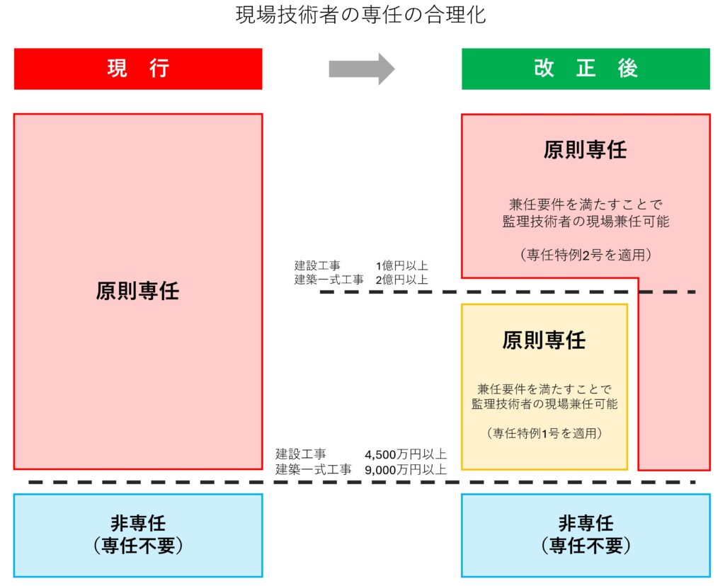 兼任現場数は、「営業所技術者」も務めていることから1工事現場に限定されています。それでも従来のことを考えればありがたい改正内容です。