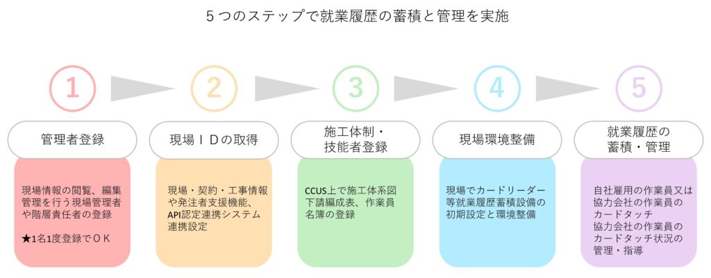 はじめに、現場監督用のカカウントとして管理者登録を行い現場管理者IDの取得を行います。2番目に現場・契約情報登録を行い現場IDの取得を行います。3番目は現場に入場する事業者と技能者を特定するために、施工体制登録・施工体制技能者登録を行います。施工体制登録・施工体制技能者登録はシステム上で施工体制図や作業員名簿を作成するイメージになります。4番目に現場で就業履歴の蓄積を行うためカードリーダーやアプリ操作用のパソコンの準備を行います。5番目に現場に入場する技能者さんを受け入れ就業履歴の蓄積をして頂きます。元請会社は現場に入場する技能者が就業履歴を蓄積しているか管理・指導を行います。